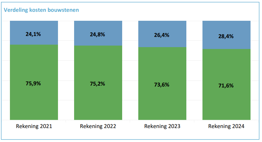 Eén van de doelen binnen de kadernota sociaal domein is het financieel grip houden op de taken die we uitvoeren. Een indicator vormt onder andere de verschuiving van maatwerk naar omgeving. Bovenstaande tabel laat de ontwikkeling van de uitgaven verhoudingsgewijs zien tussen de bouwsteen omgeving en maatwerk over de afgelopen vier jaren.
